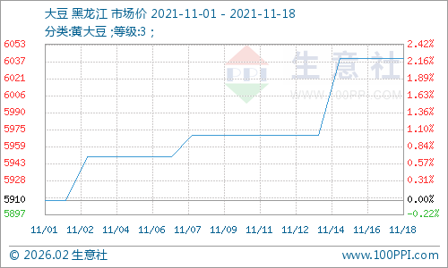 据生意社监测数据显示:11月18日,国产大豆行情平稳运行,主流报价已经突破3元/斤,部分地区商品蛋白豆3.2元/斤左右。毛粮主流报价3-3.05元/斤,筛豆报价3.15元/斤。东北地区新豆价格居高不下,市场成交一般,国储大豆陆续流拍。预计后市国产大豆或将迎来小幅回调。