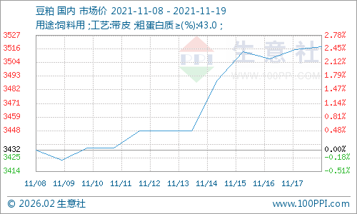 据生意社数据监测显示:11月8日开始,豆粕行情止跌回暖,价格振荡上涨,主流报价重回3500元/吨一线。截止11月19日,豆粕市场均价3516元/吨,价格上涨2.51%。