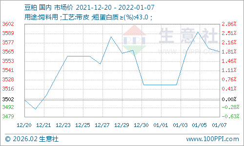 据生意社监测数据显示:元旦过后,外盘拉涨,豆粕行情回暖,价格振荡上涨。截止1月7日,豆粕市场均价3566元/吨,价格较月初上涨1.25%,较12月20日上涨1.83%。