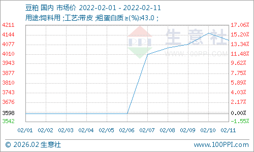 据生意社监测数据显示:春节过后,CBOT豆类大幅上涨,外盘拉涨,豆粕行情呈现上涨之势,价格几日就突破4100元/吨大关。截止2月11日,豆粕市场均价4156元/吨,价格较月初上涨15.51%。